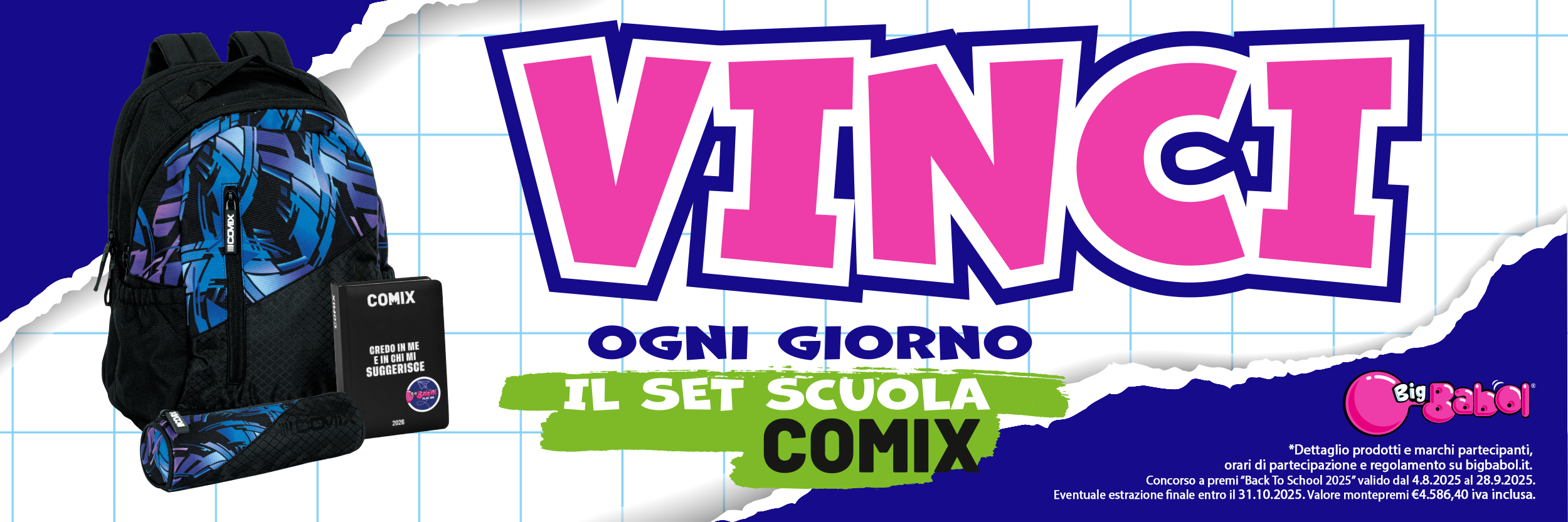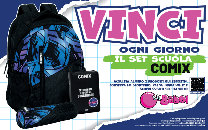 Per l’attività dedicata al Back To School 2025 di Perfetti Van Melle, in particolare per i Brand Fruittella e Big Babol abbiamo selezionato il partner Comix (Franco Cosimo Panini editore ) al fine di realizzare un concorso con in palio ogni giorno un Set Scuola by Comix!