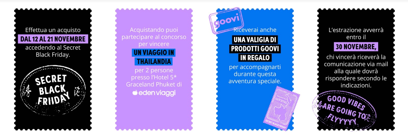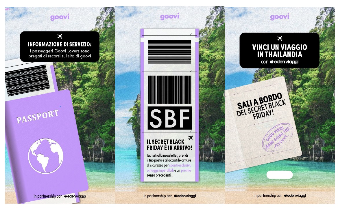 Per supportare ed incentivare i clienti Goovi ad iscriversi alle news letter in occasione del Black Friday abbiamo attivato un Co-Marketing con Eden Viaggi tra i brand leader nel settore turismo, mettendo in palio un fantastico ed esclusivo Viaggio in THAILANDIA